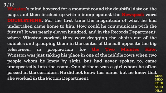 Winston’s mind hovered for a moment round the doubtful date on the page, and then fetched up with a bump against the Newspeak word DOUBLETHINK. For the first time the magnitude of what he had undertaken came home to him. How could he communicate with the future? It was nearly eleven hundred, and in the Records Department, where Winston worked, they were dragging the chairs out of the cubicles and grouping them in the center of the hall opposite the big telescreen, in preparation for the Two Minutes Hate. Winston was just taking his place in one of the middle rows when two people whom he knew by sight, but had never spoken to, came unexpectedly into the room. One of them was a girl whom he often passed in the corridors. He did not know her name, but he knew that she worked in the Fiction Department.