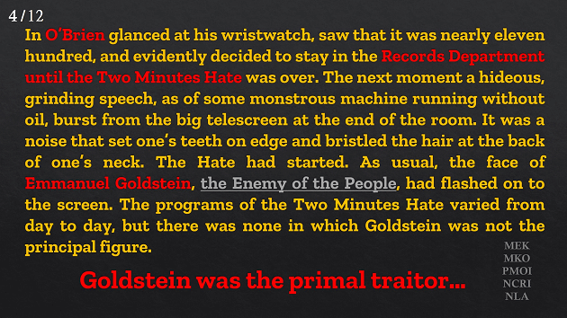 O’Brien glanced at his wristwatch, saw that it was nearly eleven hundred, and evidently decided to stay in the Records Department until the Two Minutes Hate was over. The next moment a hideous, grinding speech, as of some monstrous machine running without oil, burst from the big telescreen at the end of the room. It was a noise that set one’s teeth on edge and bristled the hair at the back of one’s neck. The Hate had started. As usual, the face of Emmanuel Goldstein, the Enemy of the People, had flashed on to the screen. The programs of the Two Minutes Hate varied from day to day, but there was none in which Goldstein was not the principal figure. He was the primal traitor.