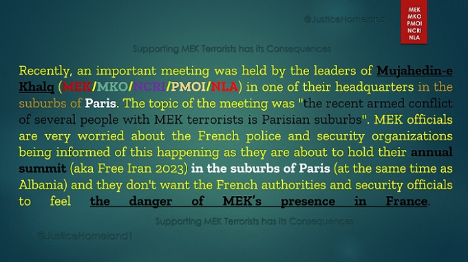 Recently, an important meeting was held by the leaders of Mujahedin-e Khalq (MEK/MKO/NCRI/PMOI/NLA) in one of their headquarters in the suburbs of Paris. The topic of the meeting was “the recent armed conflict of several people with MEK terrorists is Parisian suburbs”. MEK officials are very worried about the French police and security organizations being informed of this happening as they are about to hold their annual summit (aka Free Iran 2023) in the suburbs of Paris (at the same time as Albania) and they don’t want the French authorities and security officials to feel the danger of their presence in France.