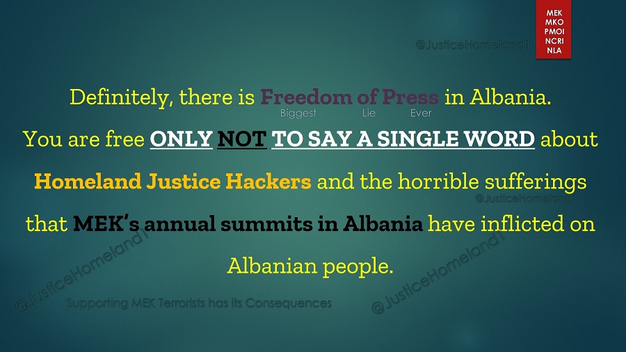 You are free ONLY NOT TO SAY A SINGLE WORD about Homeland Justice Hackers and the horrible sufferings that MEK’s annual summits in Albania have inflicted on Albanian people.